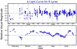 In 1856, Joseph Baxendell announced that the star, then called 13 Lyrae, is a variable star.[11] In 1907 it appeared with its variable star designation, R Lyrae, in Annie Jump Cannon's Second Catalog of Variable Stars.[12] The variability is not consistent and regular, but periods of 46, 64, 378, and 1,000 days have been reported, with the 46-day period being the strongest.[4][13]
