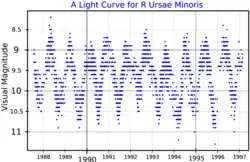 R Ursae Minoris is a star in the constellation Ursa Minor. A red giant of spectral type M7IIIe, it is a semiregular variable ranging from magnitude 8.5 to 11.5 over a period of 325 days.[3]