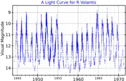 R Volantis fluctuates between magnitude 8.7 and 13.9,[6] and has a period of 445 days.[3]