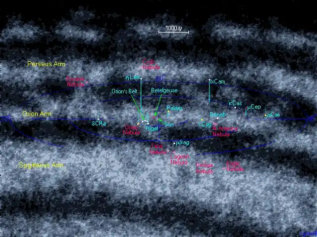 A clickable map of the nearby circa one-sixth outer sector of the galaxy, thus clearly showing the Local Arm (Orion Arm) and neighboring arms - as well as the Great Orion Nebula (as a very luminous feature of the less bright Orion molecular cloud complex) and broad-clouds North America Nebula (and Pelican Nebula) which is an intrinsic part of the Radcliffe wave.