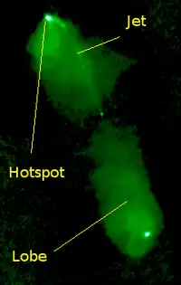 A radio galaxy is a galaxy with giant regions of radio emission extending well beyond its visible structure. These energetic radio lobes are powered by jets from its active galactic nucleus.[1] They have luminosities up to 1039 W at radio wavelengths between 10 MHz and 100 GHz.[2] The radio emission is due to the synchrotron process. The observed structure in radio emission is determined by the interaction between twin jets and the external medium, modified by the effects of relativistic beaming. The host galaxies are almost exclusively large elliptical galaxies. Radio-loud active galaxies can be detected at large distances, making them valuable tools for observational cosmology. Recently, much work has been done on the effects of these objects on the intergalactic medium, particularly in galaxy groups and clusters.