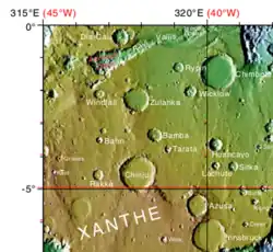 Ravi Vallis is an ancient outflow channel, the source of which originates from the Aromatum Chaos depression, and is situated at the eastern end of Xanthe Terra, in the Margaritifer Sinus quadrangle (MC-19) region of Mars, located at 0°12′S 40°42′W / 0.2°S 40.7°W. The Ravi Vallis outflow channel is 205.5 km (127.7 mi) long, and starts at the northeastern end of the Aromatum Chaos depression. The channel is orientated in an easterly direction, and further down channel, Ravi Vallis divides into two; a larger northern channel, and a smaller southern channel, and is finally truncated by a fault which is located at the western margin of the Hydraotes Chaos depression. Ravi Vallis was named after the Ravi River, an ancient Indian river.[1][2][3][4][5]