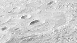 This is an eroded formation with a rim that has been worn and reshaped by impacts. This is particularly so in the south where the rim has been modified and supplemented by adjacent crater formations and several small craters that lie along the rim.