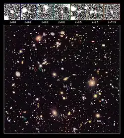 71. Oesch, P. A.; et al. (March 1, 2016). "A Remarkably Luminous Galaxy at z=11.1 Measured with Hubble Space Telescope Grism Spectroscopy". The Astrophysical Journal. 819 (2): 129. arXiv:1603.00461. Bibcode:2016ApJ...819..129O. doi:10.3847/0004-637X/819/2/129. S2CID 119262750.