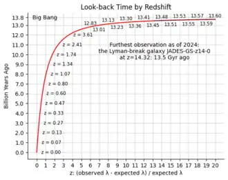 The lookback time of extragalactic observations by their redshift up to z=20.[48] There are websites for calculating many such physical measures from redshift.[32][33][34][35]
