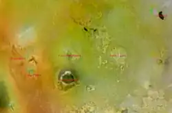 Reiden Patera is a volcanic feature on Jupiter's moon Io. It was first detected by the Galileo SSI Team during the spacecraft Galileo's first orbit around Jupiter, initially detected as a hotspot. It was once thought that the activity there had stopped or waned below the limits of the spacecraft's Solid State Imager or Near-Infrared Mapping Spectrometer.[1] However, it was noticed in 2002 that Reiden Patera has darkened considerably since the 24th orbit of Galileo. It has been spouting bright red pyroclastic deposits of its own.[2] It is located at 13°24′S 235°27′W / 13.4°S 235.45°W and is 70 kilometers in diameter. It is named after a Japanese thunder god ("Raijin" in current English nomenclature).[3] Asha Patera can be found to the east, and Kami-Nari Patera can be found to the north.[4]