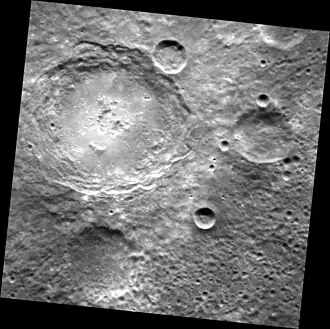 There is an irregular depression near the center of the crater. Such depressions in similar craters (for example Glinka, Gibran, or Picasso) are thought to be caused by volcanism.