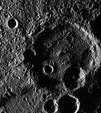 To the immediate south of Roerich is Lovecraft crater. Beyond it is Chao Meng-Fu crater, at the south pole.