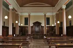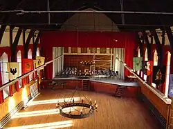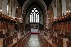 The original school dining hall burnt down in the 1920s. The replacement, the current dining hall, was designed by Sir Hubert Worthington.[21] The design was not without fault however – it was constructed from bricks encased in a weatherable coating that would dissolve away to leave it looking in the same condition as the rest of the square. The largest section of wood panelling behind the headmaster's table in the dining hall is made from an oak tree that grew in the back garden of George Mallory.[22] It was claimed in 1944 that it was the largest school dining hall in the country,[23] and was described by F. A. M. Webster in his book Our Great Public Schools as, "one of the most splendid in the country."[24]