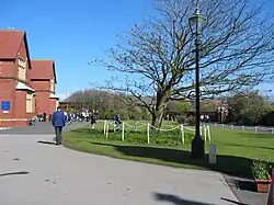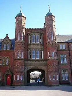 This was erected in 1867, under the reign of William Osborne, with the foundation stone being laid by William Cavendish, 7th Duke of Devonshire.[17] It is believed to have been designed by Edward Graham Paley. It is clearly modelled on the entrance gates of the Oxbridge colleges and originally had large wooden doors which were locked at night; these have since been removed for improvements in access.[18]