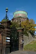 The original 1894 building includes two cylindrical copper domes on top of the East and West Towers. These were refurbished in 2010.[2] The East Dome still shelters a 36-inch (0.9 m) Cassegrain reflector that was installed in 1930. This is part of the visitor centre exhibition, but is not operational any more. A 16/24-inch (0.4/0.6 m) Schmidt camera was installed in the West Dome in 1951. In 2010 this was removed to the National Museum of Scotland.[3] The only working telescope is a Meade MAX 20in ACF (0.5 m) reflector in a hemispherical dome on top of the teaching laboratories. This telescope is used for undergraduate teaching. As of April 2012, the 1967 telescope and mount have been removed to Mid-Kent Astronomical Society; a replacement telescope will be installed later in 2012.[4]