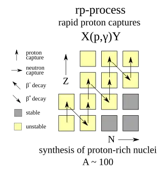 The rp-process (rapid proton capture process) consists of consecutive proton captures onto seed nuclei to produce heavier elements.[1] It is a nucleosynthesis process and, along with the s-process and the r-process, may be responsible for the generation of many of the heavy elements present in the universe. However, it is notably different from the other processes mentioned in that it occurs on the proton-rich side of stability as opposed to on the neutron-rich side of stability.