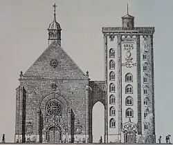 Longomontanus' initial proposal was to erect the new observatory on the top of the hill Solbjerget, now known as Valby Bakke. But since there were also plans for the construction of a new students' church and a library for the university, the idea of merging the three buildings into one grand complex emerged.[2]
