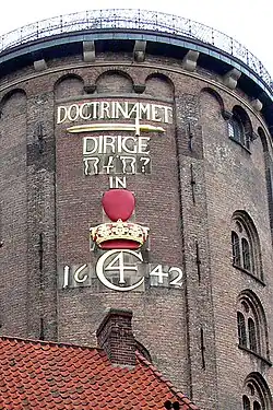 On the upper part of the façade of the tower, there is a gilded rebus inscription. Christian IV's draft of it, written in his own hand writing, is kept at the Danish National Archives. The rebus includes the four Hebrew consonants of the Tetragrammaton. The rebus can be interpreted in the following way: Lead Jehovah, the right teaching and justice into the heart of the crowned King Christian IV, 1642.[8]