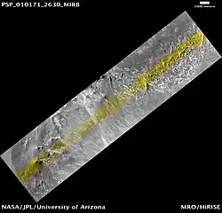 Rupes Tenuis is the strip in the middle of the image. The polar cap is on the top side of the image with the lower elevation at the bottom.