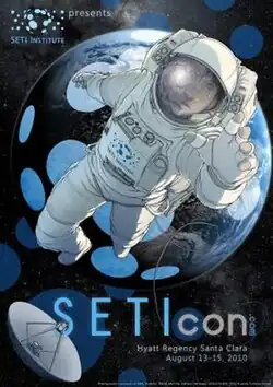 SETIcon was a public convention organized by the SETI Institute and held twice in Santa Clara, California. It was an interdisciplinary conference, with talks focusing on a wide range of issues related to the search for extraterrestrial intelligence (SETI). The programs included panels with prominent scientists from NASA and SETI; talks by science fiction writers, artists, and actors; and panels to explore controversial issues and compare perspectives.[1] The sessions were non-technical and meant to increase awareness, interest, and funding for the SETI Institute. The convention attracted professional scientists, educators, space enthusiasts, and science fiction fans. Astronomical tattoos were not uncommon among attendees.[2]