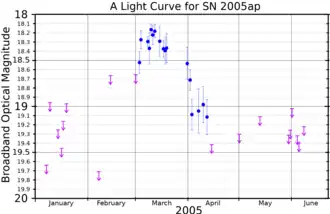 ![]() A light curve for SN 2005ap, adapted from Quimby et al. (2007).[1] The purple arrows mark the upper limits for nondetections. | |