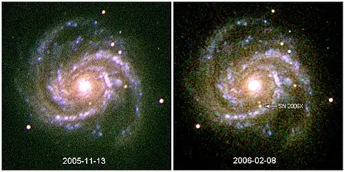 SN 2006X was a Type Ia supernova about 65 million light-years away[1] in Messier 100, a spiral galaxy in the constellation Coma Berenices. The supernova was independently discovered in early February 2006 by Shoji Suzuki of Japan and Marco Migliardi of Italy.