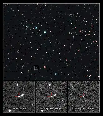 - ↑ "Hubble Breaks Record in Search for Farthest Supernova". Hubble Space Telescope. 2013-04-04.