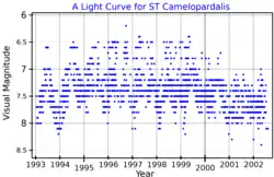 ST Cam is a semiregular variable star. It is doubly periodic, with the two pulsation periods P0 and P1 being equal to 368.6 and 201 days respectively.[10]