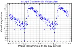 In 1921, it was announced that Johanna C. Mackie had discovered the star's brightness varies.[9] It was given its variable star designation in 1922.[10] SV Vulpeculae is a δ Cepheid variable whose visual apparent magnitude ranges from 6.72 to 7.79 over 45.0121 days. The light curve is highly asymmetric, with the rise from minimum to maximum taking more less than a third of the time for the fall from maximum to minimum.[11] The period has been decreasing on average by 214 seconds/year.[12]