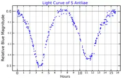 S Antiliae is classed as an A-type W Ursae Majoris variable, since the primary is hotter than the secondary and the drop in magnitude is caused by the latter passing in front of the former. S Antiliae varies in apparent magnitude from 6.27 to 6.83 over a period of 15.6 hours.[3] The system shines with a combined spectrum of A9V.