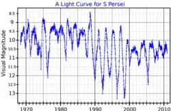 S Persei varies slowly by several magnitudes, a factor of over 40 in brightness. It has a main period of somewhat over two years, but shows significant unpredictability. There is a strong variation in the amplitude from around one magnitude to about four magnitudes, and these have been interpreted as beats due to a second period of about 940 days.[15] Other analyses find only the primary period of 813 ± 60 days.[16]