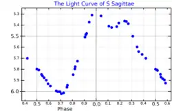 S Sagittae, also known by the Flamsteed designation of 10 Sagittae, a Classical Cepheid variable in the constellation Sagitta that varies from magnitude 5.24 to 6.04 in 8.382 days.[2] Its variable star designation of "S" indicates that it was the second star discovered to be variable in the constellation. Irish amateur astronomer John Ellard Gore was the first to observe its variability in 1885, and Ralph Hamilton Curtiss discovered its changing radial velocity in 1903–04.[11] Harlow Shapley observed in 1916 that the spectrum of it and other Cepheids varied with its brightness, recording it as spectral type F0 leading to maximum, F4 at maximum, and G3 just before minimum brightness.[12]