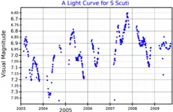 Louisa Dennison Wells discovered that the star is a variable star. Her discovery was announced in 1901.[7] It was listed with its variable star designation, S Scuti, in Annie Jump Cannon's 1907 work Second Catalog of Variable Stars.[8] S Scuti is a semiregular variable star. Its class is SRb, and its pulsation cycle lasts 148 days.[4] S Scuti is also surrounded by a roughly spherical shell of dust. The shell was known earlier from its carbon monoxide emission lines.[6] The total mass of the dust is (7 ± 2)×10−5 M☉.[6]