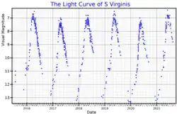 S Virginis is a Mira-type variable star in the constellation Virgo. Located approximately 700 parsecs (2,300 ly) distant,[2] it varies between magnitudes 6.3 and 13.2 over a period of approximately 375 days.[4]