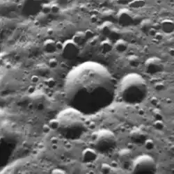 Samad is a crater in the northern hemisphere of Saturn's geologically active moon Enceladus.[1] Samad was first discovered in Voyager 2 images. It is located at 60.3° North Latitude, 4.5° West Longitude and is 16.3 kilometres (10.1 mi) across. Currently available images are too low in resolution to determine if this crater has been tectonically deformed, but the lack of a prominent central dome suggests Samad has not undergone the level of viscous relaxation of other craters in its size range, like Dalilah or Ahmad. Samad is located near the larger craters Aladdin and Ali Baba.[2]