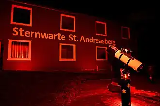The Sankt Andreasberg Observatory is located near the Rehberg on the premises of the Internationale Haus Sonnenberg, an international educational facility. It is one of the most elevated observatories in northern Germany.[1][6][7] The air in an altitude of 710 metres[3] is especially low on turbidity and since the Harz Nature Park is far away from big cities, there is far less light pollution there then in other parts of northern Germany. According to the Federal Agency for Nature Conservation, Sankt Andreasberg is one of the six best locations for astronomy in Germany.[3][7] In April 2011 the Sky Quality Meter measured 21,81 mag/arcsec².