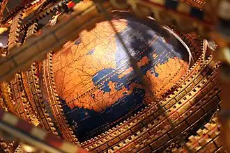 Begun on March 4, 1588, and completed on May 6, 1593, this large armillary sphere was built under the supervision of Antonio Santucci at the request of Ferdinand I de' Medici. The sphere represents the "universal machine" of the world according to the concepts developed by Aristotle and perfected by Ptolemy. The terrestrial globe is placed at the center, and it also displays territories that were still relatively little known at the time: notably, it includes both Lake Albert and Lake Victoria in central Africa, which were apparently forgotten again until the explorations of Samuel Baker and John Hanning Speke over 250 years later.[2]
