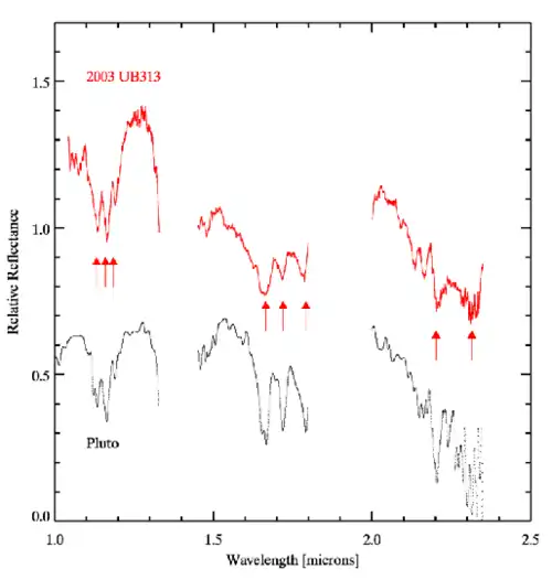 Scattered objects, like other trans-Neptunian objects, have low densities and are composed largely of frozen volatiles such as water and methane.[42] Spectral analysis of selected Kuiper belt and scattered objects has revealed signatures of similar compounds. Both Pluto and Eris, for instance, show signatures for methane.[43]