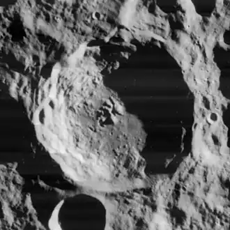 This is a relatively well-defined crater with sharp features that have not been significantly worn down by minor impacts. The rim is roughly circular and sharp-edged, with a complex inner wall marked by slumping and many ridges and terraces. The inner floor is relatively flat and level, although somewhat rougher in the western half. At the midpoint of the interior is a central peak complex formed by several ridges.