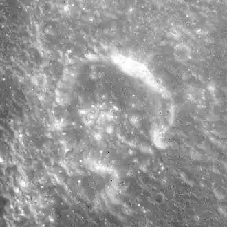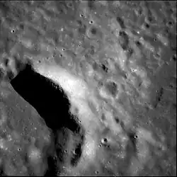 Secchi is a small lunar impact crater formation on the northwest edge of Mare Fecunditatis. It was named after the 19th-century Italian astronomer Angelo Secchi.[1] To the northeast is the crater Taruntius. The western rim is joined with a section of the minor Montes Secchi range. The rim of this crater has been opened in the northern and southern ends, leaving two curved ridges facing each other across the crater floor. To the south is a pair of rilles designated the Rimae Secchi. These lie near the edge of the mare, and have a combined length of about 40 kilometers.