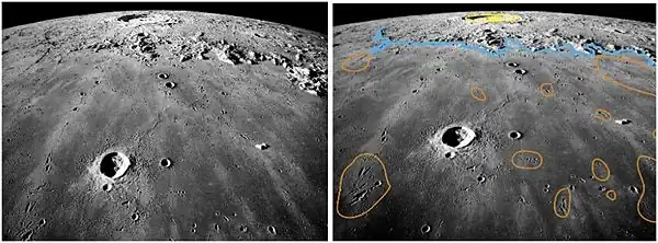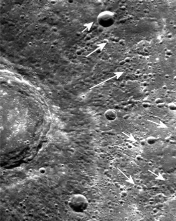 {{cite journal}}: Cite journal requires|journal=(help) - ↑ Plescia, J.B.; Robinson, M.S. (2015). "Lunar self-secondary cratering: implications for cratering and chronology" (PDF). 46th Annual Lunar and Planetary Science Conference (1832): 2535. Bibcode:2015LPI....46.2535P. Retrieved 2 March 2015.