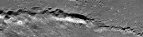 Secondary craters may appear as small-scaled singular craters similar to a primary crater with a smaller radius, or as chains and clusters. A secondary crater chain is simply a row or chain of secondary craters lined adjacent to one another. Likewise, a cluster is a population of secondaries near to one another.[6]
