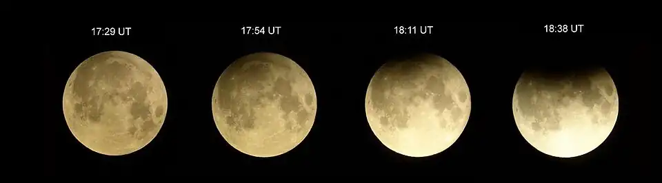 A partial lunar eclipse occurred at the Moon’s ascending node of orbit on Thursday, September 7, 2006,[1] with an umbral magnitude of 0.1837. A lunar eclipse occurs when the Moon moves into the Earth's shadow, causing the Moon to be darkened. A partial lunar eclipse occurs when one part of the Moon is in the Earth's umbra, while the other part is in the Earth's penumbra. Unlike a solar eclipse, which can only be viewed from a relatively small area of the world, a lunar eclipse may be viewed from anywhere on the night side of Earth. Occurring only about 4 hours before perigee (on September 7, 2006, at 23:00 UTC), the Moon's apparent diameter was larger.[2]