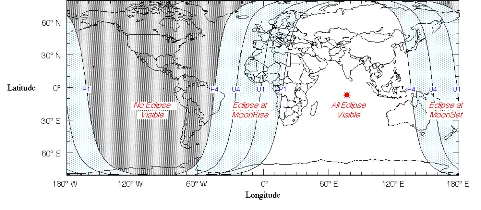 The eclipse was completely visible over Asia, east Africa, eastern Europe and western Australia, seen rising over west Africa and western Europe and setting over eastern Australia and the western Pacific Ocean.[3]