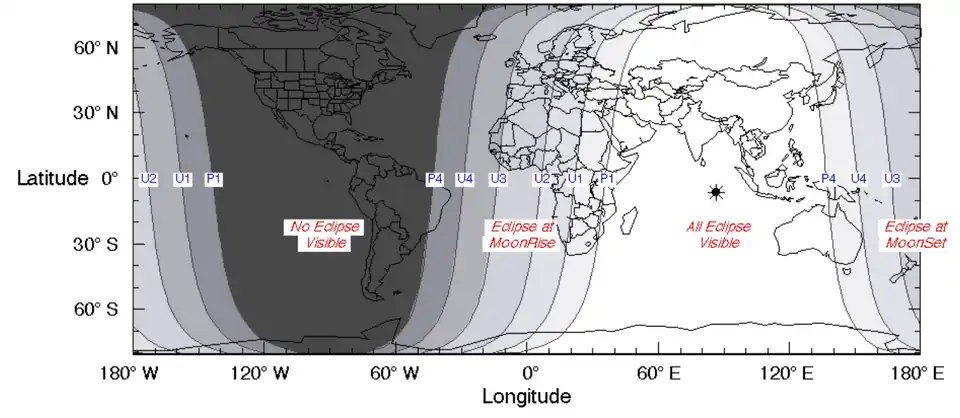 The eclipse will be completely visible over east Africa, Asia, and Australia. It can be seen when it is rising over most of Africa and Europe. It can be seen when it is setting over the central Pacific Ocean.[3]