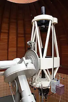 A Serrurier truss is used in telescope tube assembly construction. The design was created in 1935 by engineer Mark U. Serrurier when he was working on the Mount Palomar 200 in (5.1 m) Hale Telescope.[1] The design solves the problem of truss flexing by supporting the primary objective mirror and the secondary mirror by two sets of opposing trusses before and after the declination pivot. The trusses are designed to have an equal amount of flexure, which allows the optics to stay on a common optical axis. When flexing, the "top" truss resists tension and the "bottom" truss resists compression. This has the effect of keeping the optical elements parallel to each other. The net result is all of the optical elements stay in collimation regardless of the orientation of the telescope.
