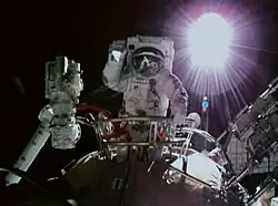 On 7 November 2021, the first scheduled spacewalk of Shenzhou 13 was carried out by Zhai Zhigang and Wang Yaping, during which Wang Yaping became the first Chinese woman to perform a spacewalk.[12] The two taikonauts installed a dual-arm connector for the station's robotic arm, and tested EVA equipment on the exterior of Tianhe. The spacewalk lasted for 6 hours and 25 minutes.[13]