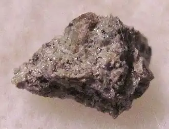 The Shergotty meteorite (named after Sherghati) is the first example of the shergottite Martian meteorite family. It was a 5-kilogram (11 lb) meteorite which fell to Earth at Sherghati, in the Gaya district, Bihar, India on 25 August 1865, and was retrieved by witnesses almost immediately.[1] Radiometric dating indicates that it solidified from a volcanic magma about 4.1 billion years ago.[2] It is composed mostly of pyroxene and is thought to have undergone preterrestrial aqueous alteration for several centuries. Certain features within its interior are suggestive of being remnants of biofilm and their associated microbial communities.[3]
