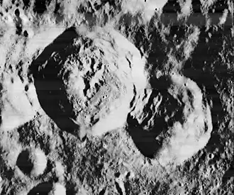 ![]() Lunar Orbiter 1 image of Shirakatsi crater (left) and Dobrovol'skiy crater (right) | |
