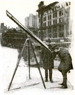 Examples of people setting up telescopes on urban streets for public astronomical viewing go back well into the 19th century and maybe even further.[4][5][6][7] Sidewalk astronomers and their telescopes have been a common sight in most big cities.[8] There are many examples in the past such as Frank Manning in New Orleans as early as 1930[9] and Mr Grosser in Los Angeles in the 1870s, who not only set up a telescope but also an illuminated microscope. Some sidewalk "pitch men" charged the public to view astronomical objects through their telescope but other astronomers allow people to view for free.[6][10] In more recent years sidewalk astronomy has come to be more associated with altruistic individuals or groups offering views of the nighttime sky as a free public educational service.[11]