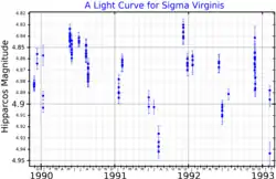 Sigma Virginis (σ Vir, σ Virginis) is a star in the zodiac constellation of Virgo. It can be faintly seen with the naked eye with a baseline apparent visual magnitude of 4.86.[2] Based upon parallax measurements, the distance to this star is roughly 680 light-years.
