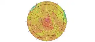 Terra Sirenum is a large region in the southern hemisphere of the planet Mars. It is centered at 39°42′S 150°00′W / 39.7°S 150°W and covers 3900 km at its broadest extent. It covers latitudes 10 to 70 South and longitudes 110 to 180 W.[1] Terra Sirenum is an upland area notable for massive cratering including the large Newton Crater. Terra Sirenum is in the Phaethontis quadrangle and the Memnonia quadrangle of Mars. A low area in Terra Sirenum is believed to have once held a lake that eventually drained through Ma'adim Vallis.[2][3][4]