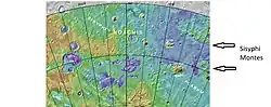 Sisyphi Montes is a mountain range within the Sisyphi Planum on the planet Mars. The mountain range various degrees of degradation.[1] It has a diameter of 200 kilometres (124 mi). The name Sisyphi Montes is a classical albedo name. This was approved by International Astronomical Union in 1985.[2][3] The classical name comes from the myth of Sisyphus, in Greek mythology. Sisyphus, the king of Corinth, was punished in Hades by having to roll a huge stone up a hill only to have it roll down again as soon as he had brought it to the top. He had to do this over and over again.[4] There are a number of mountains in this range, hence the plural form of Sisyphus is used for this group of mountains.[5]