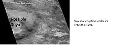 Some researchers have suggested that a large ice sheet covered much of the Mare Australe quadrangle.[7] [8][9] Sisyphi Montes consists of about 100 dome-like structures that resemble volcanoes that have erupted under ice sheets on the Earth.[10] Similar shapes are present in Iceland. These domes are quite far from the present ice sheet (1,600 kilometers). The current cap is only about 350 kilometres across, so the ice cap in the past would have been way bigger and held much more water.[11]